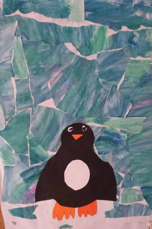 Für die passende Eislandschaft sorgt eine Collage aus kalten Farben und Eisschollen, in die der Pinguin abschließend eingefügt wurde. Toll zu sehen, wie unterschiedlich die Pinguine geformt wurden. Weitere Exemplare gibt es in unserer Schule zu entdecken.
